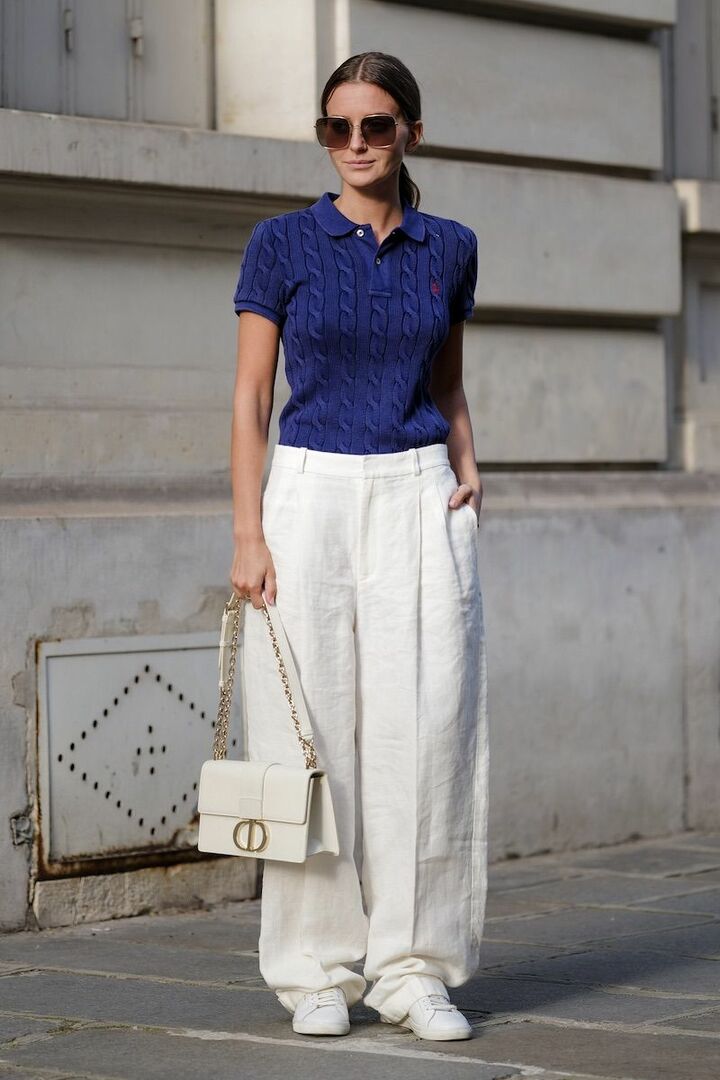 発色のよいネイビーの半袖ポロニットに、かさっとした風合いの白ワイドリネンパンツを合わせ涼感を放って。白の小物で統一感をつくりながら、スニーカーを迎え軽快さを上乗せ。