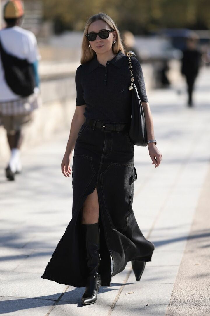 小物まで徹底的に黒で統一したオールブラックコーディネートは、リブニット、デニム、レザーという異なる質感をミックスして単調になるのを防止。さらにポロニットの襟とスカートのフロントスリットが心地よいリズムを授けてくれます。