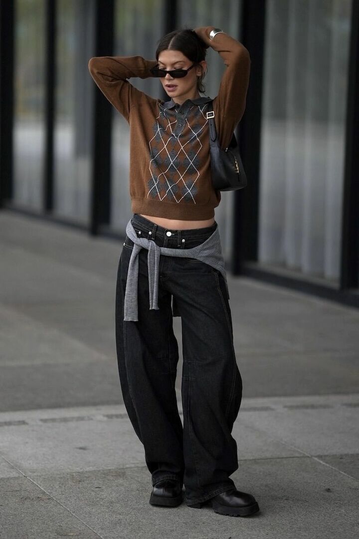 ブラウンや黒、グレーで構成するベーシックカラーコーディネートも、アーガイル柄のポロニットを活用すれば物足りなさを解消できます。さらに柄の色を拾ったカーディガンをさらりと腰に巻き、立体感をアップ。