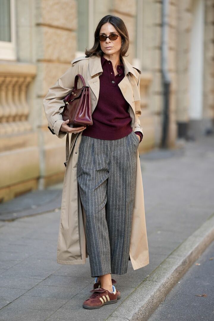 バーガンディのポロニットとバッグがアクセントになり、ベージュとグレーのワントーンに奥行きを生み出すことに成功。バッグのツヤとパンツのストライプ模様が立体感を高めます。クロップド丈のパンツにスニーカーを添えれば、軽快さまでクリア。