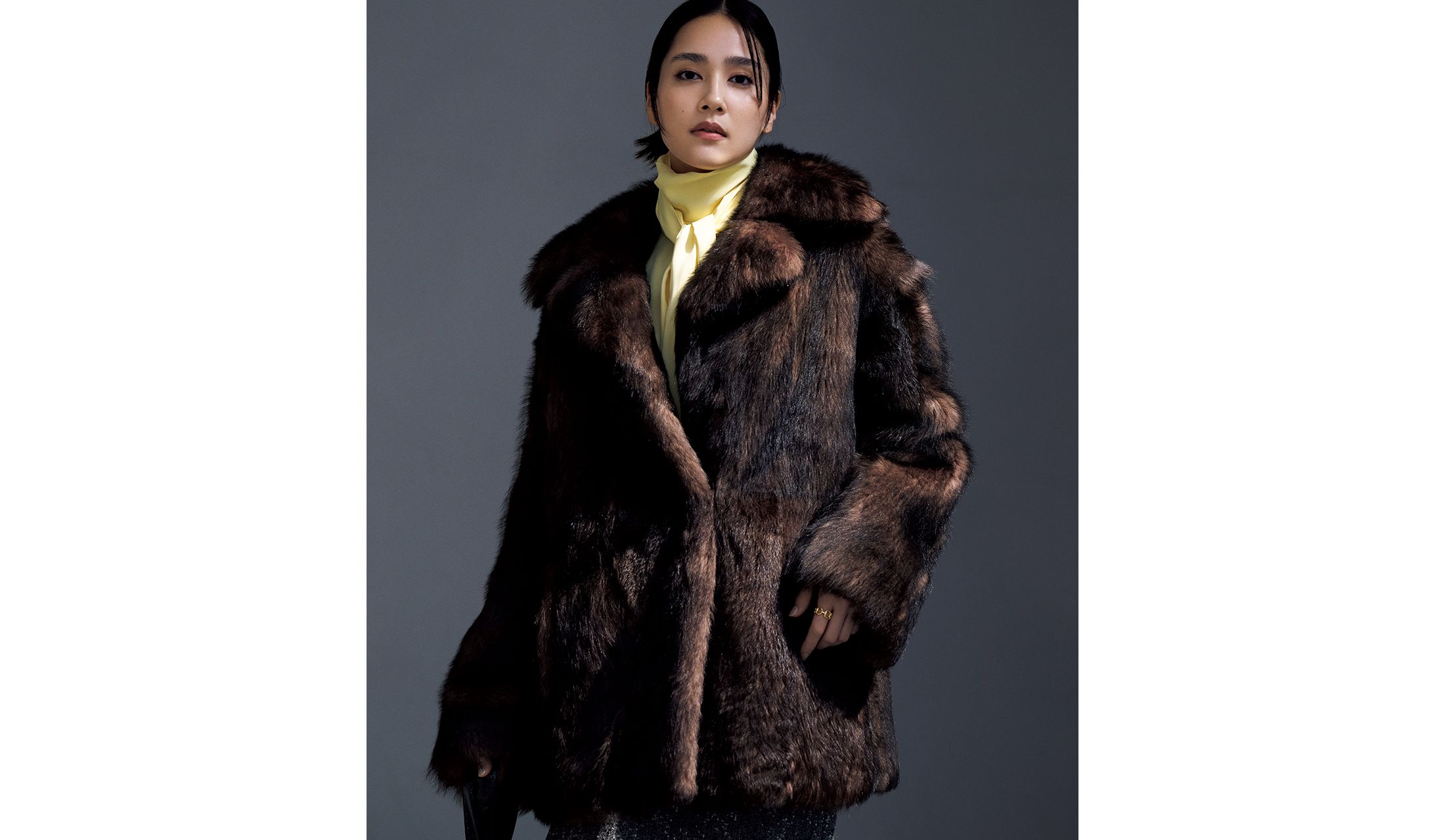 豊かな毛並が波打つように艶めくダークブラウンのシアリングコートは、ゴージャスな迫力がありながらショート丈ゆえのこなれ感が漂うのが魅力。