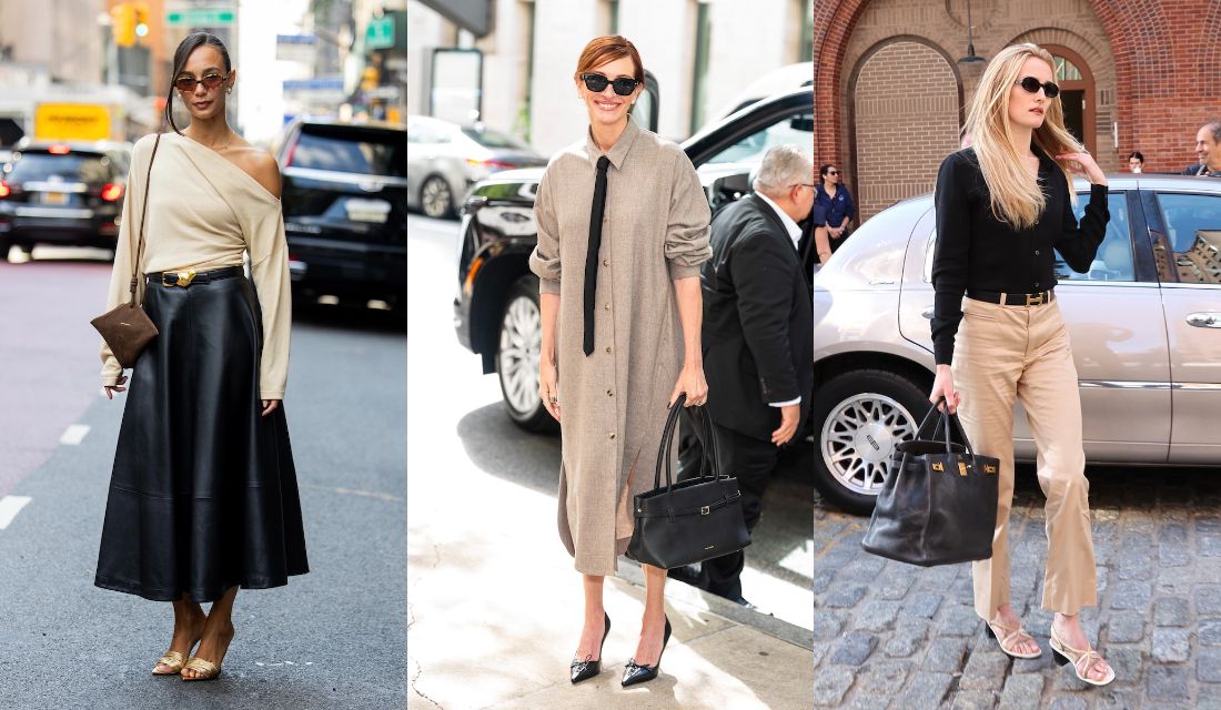 2025年9月8日、ジョン・F・ケネディ・ジュニアとキャロリン・べセット=ケネディのロマンスと悲劇を描いたドラマ『American Love Story(原題)』のセット内で撮影された、主演俳優のサラ・ピジョン。舞台となった1990年代を想わせるミニマルシックな衣装です。ベージュと黒のシンプルな装いは、黒を上に、ベージュを下に配置するとおのずとベージュの面積が広まり、品のよさが加速。緩やかに広がるフレアパンツをきゅっとベルトマークして、しなやかさを倍増させました。プレーンな上下に奥行きが宿る、リュクスなツヤを備えたビッグハンドバッグが好アクセントです。