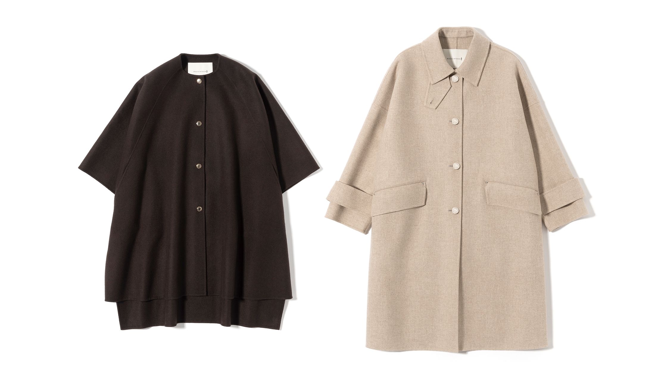 スーパー120Sウールメルトンの上質な素材感が際立つ美しいドレープが印象的な、ノーカラーのケープコート『サンクハー』。マッキントッシュ ギンザシックス店の限定色として、ビターな色味のチョコレートカラーが新登場しました。シックでありながら、どこかこなれたムードにまとまる絶妙な色合いです。