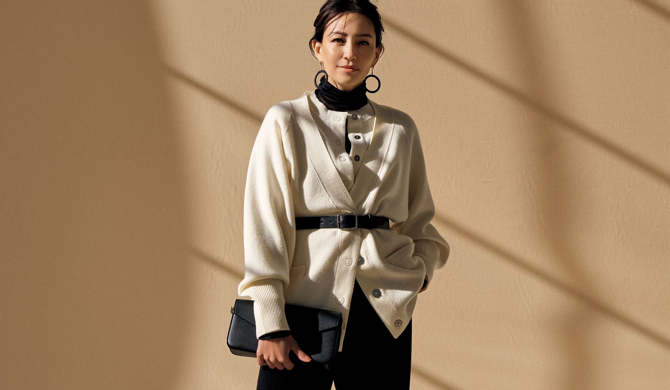 秋のモノトーンは、重く見えないよう白を多めに「効かせ」て。白いトップスの襟元にタートルニットで黒をのぞかせるだけで、こなれたレイヤード感が生まれる。カーディガンは共にミラノリブでジャケット感覚の端正な印象があり、黒ベルトでさらに女らしさをプラスしたい。