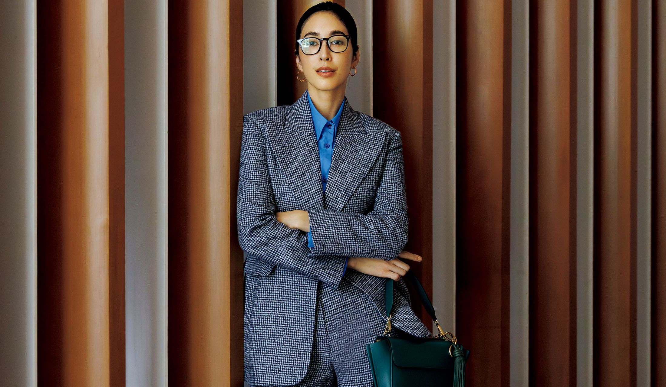 ショルダーパッドで強調された肩とシェイプしたウエスト。メリハリ豊かなシルエットに、コケットな魅力とシャープさが漂う一着で、マチュアな大人ならではのオーラを語って。千鳥格子柄も、知的な華やぎを醸す。