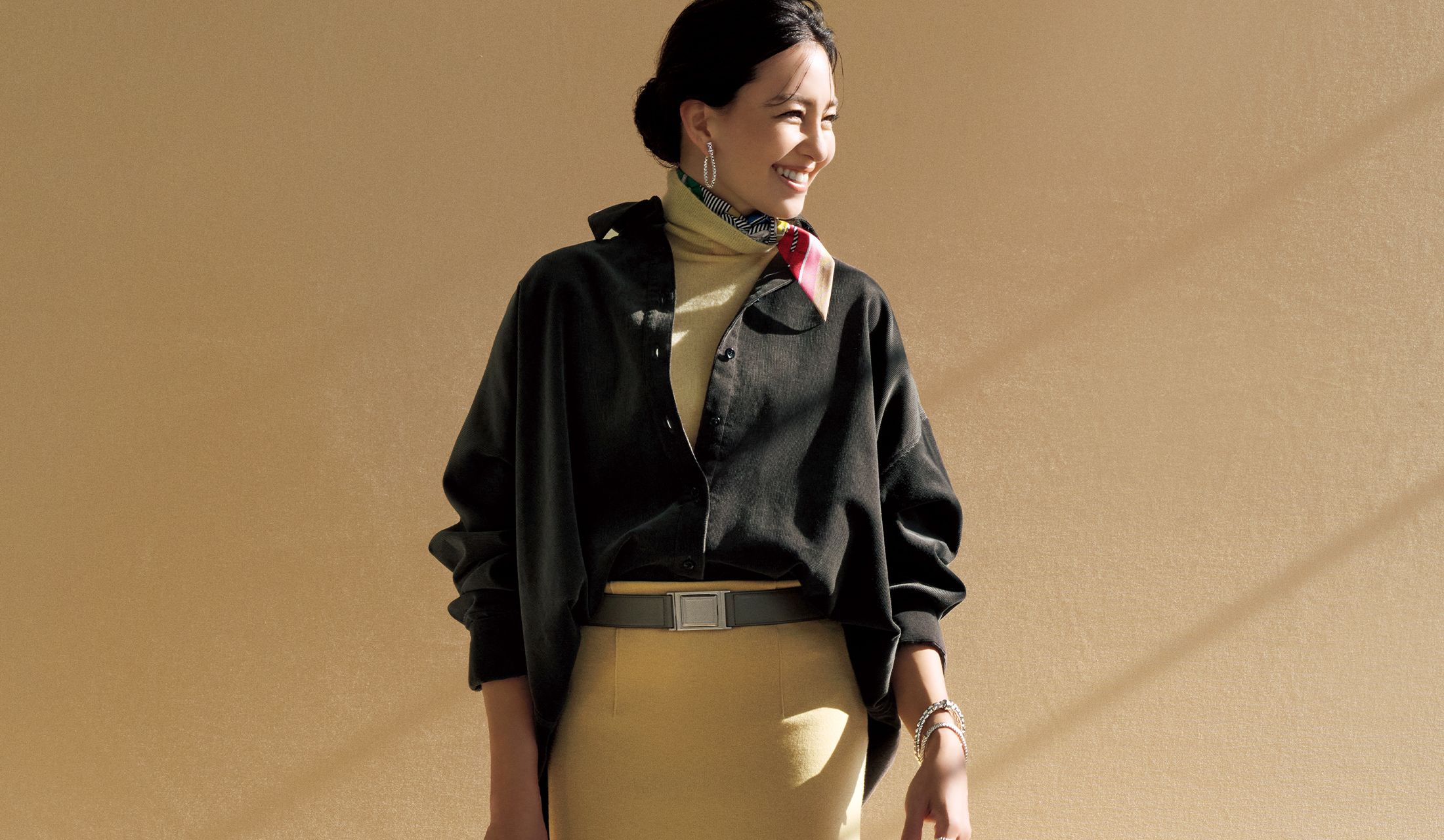 この秋、注目のコーデュロイ素材のシャツ。茶色がかった絶妙なダークグレーのニュアンスを生かすのが、イエローとの掛け合わせ。白よりも、まろやかに「効かせ」るイエローが、秋レイヤードの美しさを伝えてくれる。ボトムはウールストレッチの細長シルエットですっきり。襟元にピンクや赤を差して顔周りを引き締めて。