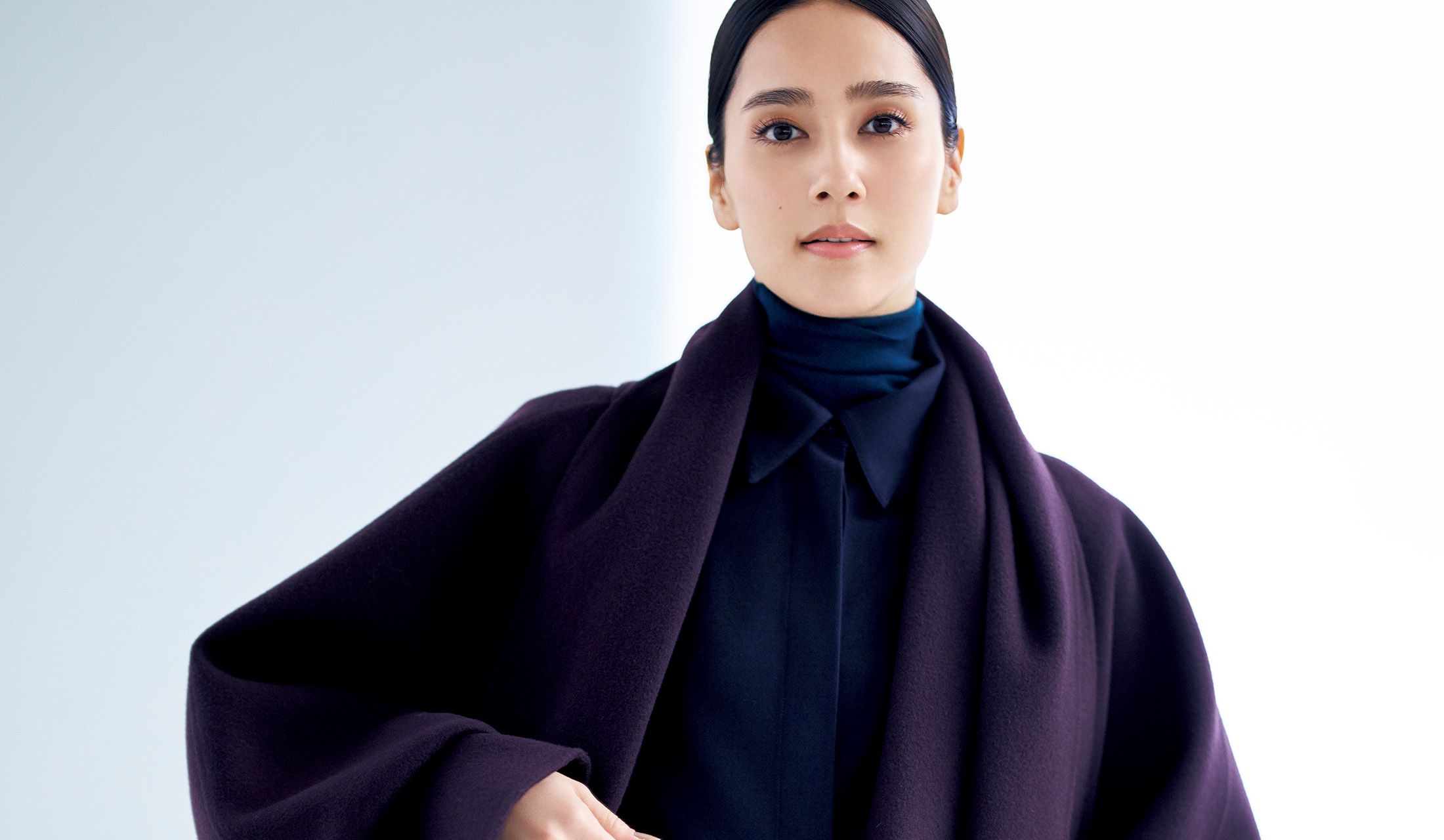 冬にはそこにパープルのケープ風コートをオン。優雅なボリュームやグラデーション配色で美しく季節を深めて。