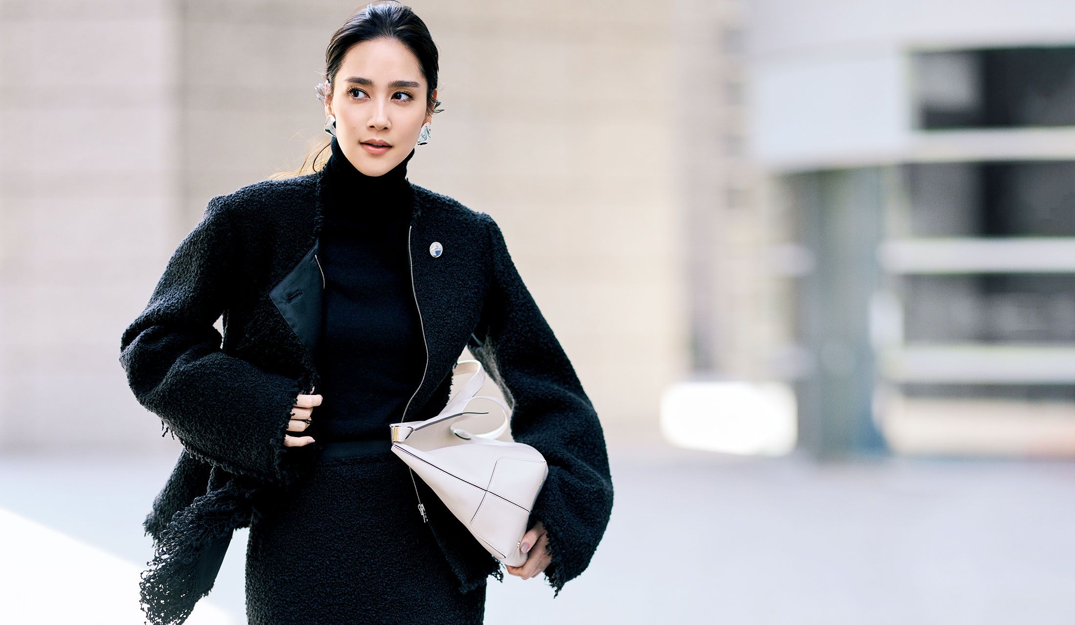 風合いのあるウールスカートとノーカラージャケットを合わせた、オールブラックのコーディネート。黒一色の装いはアイテムのテクスチャーを意識して、着こなしに奥行きをもたせるのが成功の秘訣。
