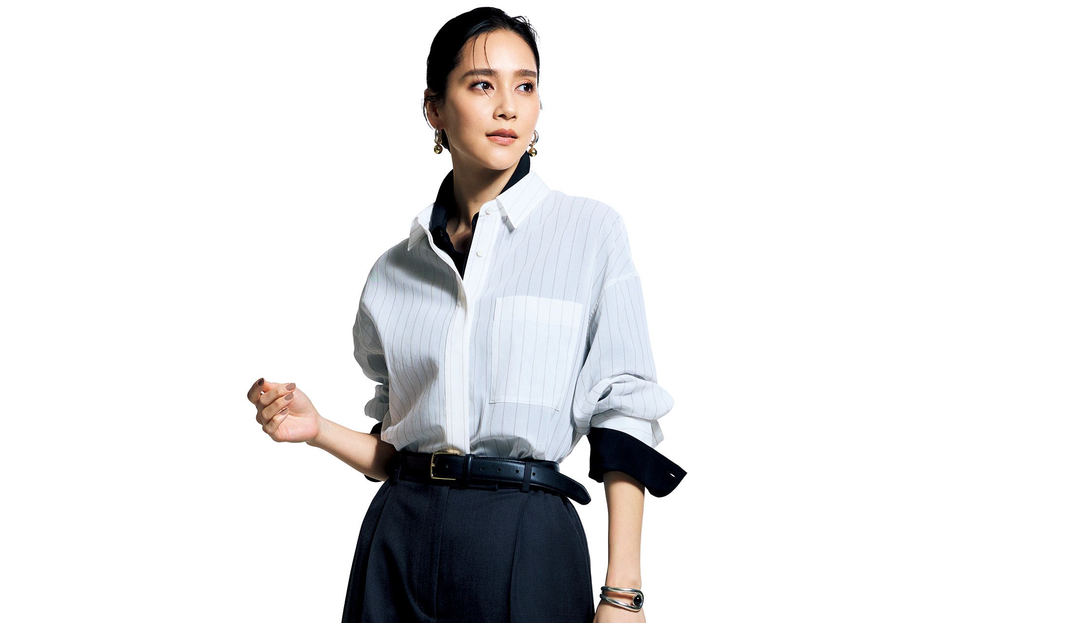 雑誌『Precious(プレシャス)』が提案する365日のコーディネート。本日お届けするのは、「エブール」のストライプシャツ、「コー」の黒シャツ、「エブール」のワイドパンツの着こなしです。
