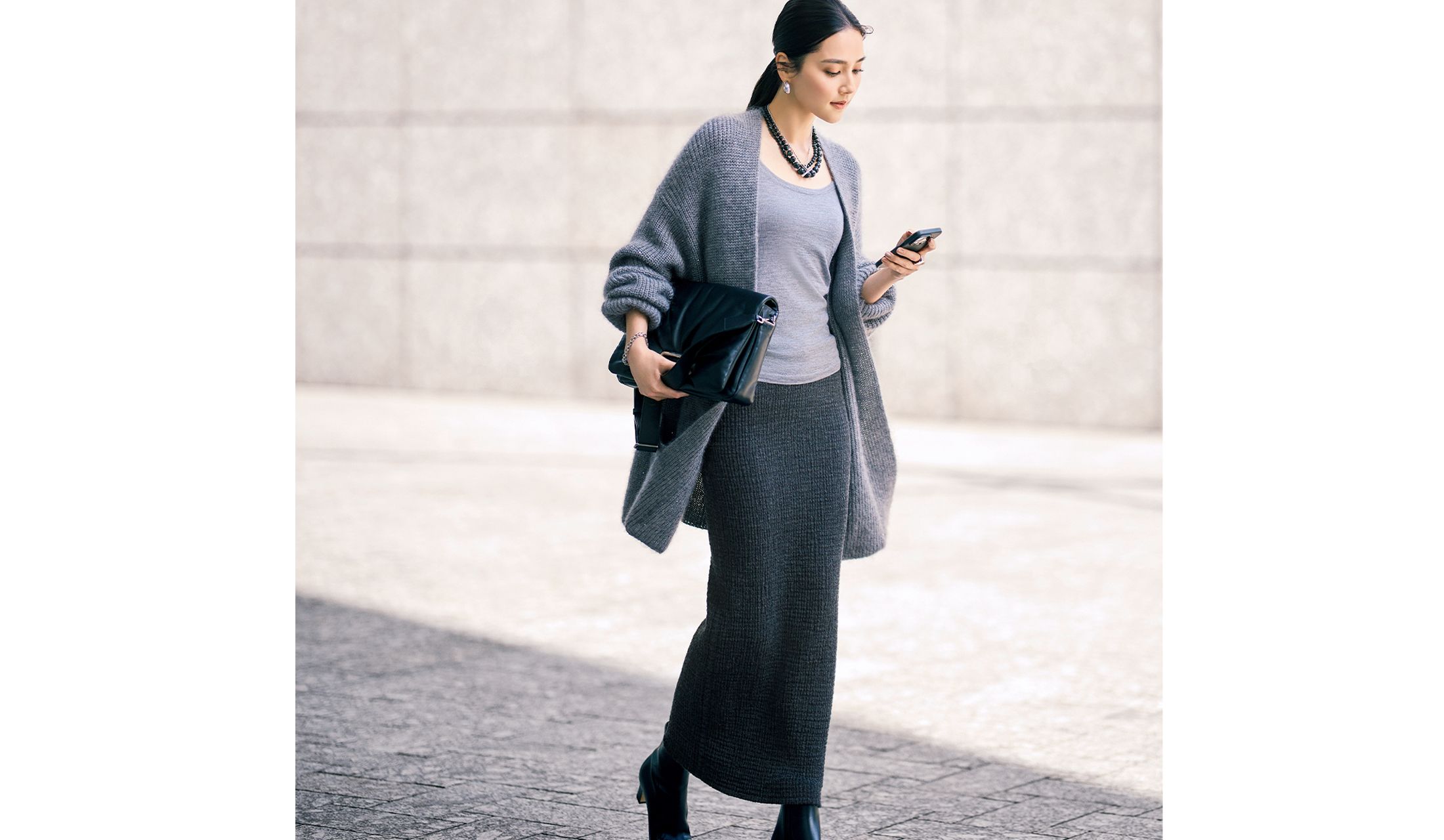 表情違いのニットを掛け合わせた、グレーのグラデーション配色。レザーのビッグバッグやクールなジュエリーを効かせて、ニットonニットをオフィス仕様にシフト。