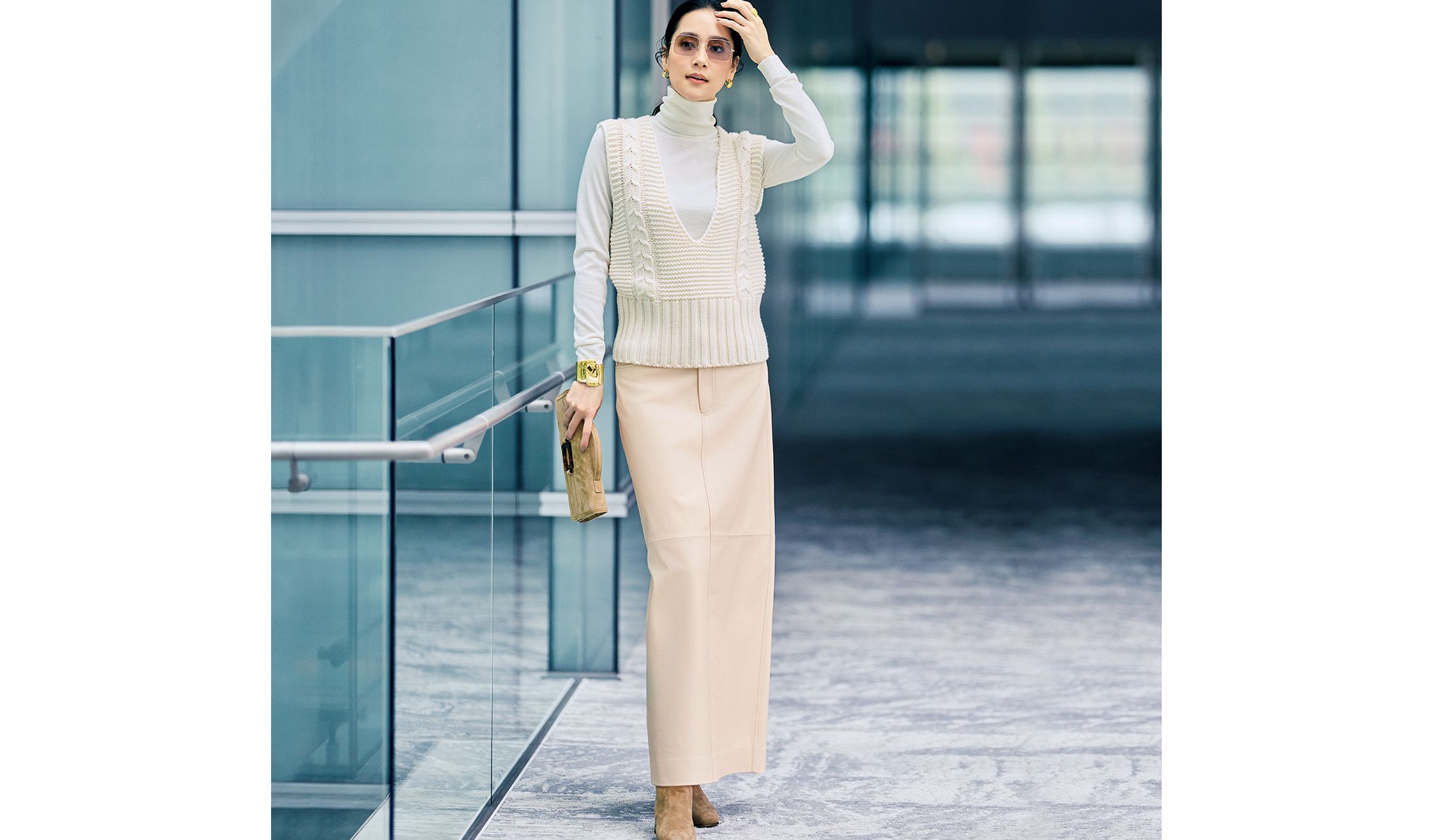 秋冬ならではのリッチ素材を重ねてクリーミートーンを堪能