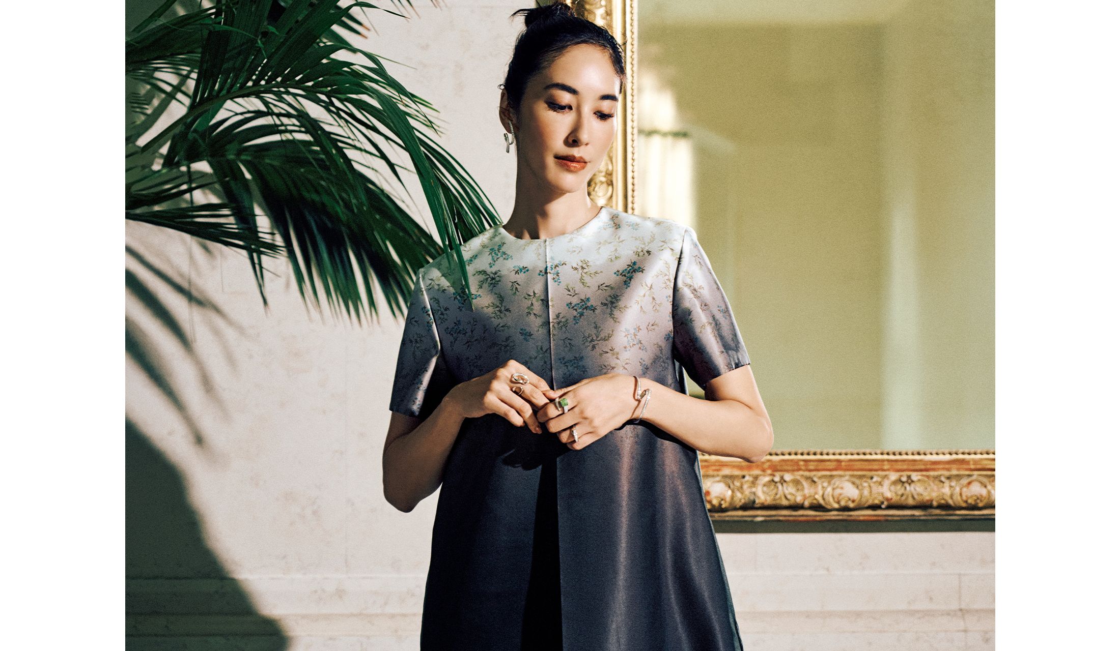 特に海外ゲストを迎える場合など、小柄で華奢な日本女性にとって、肌見せやボディラインを気にすることなく、上品に、堂々と着こなせる。可憐な花柄のグラデーションプリントのドレスは、着物に通じる美しさが。