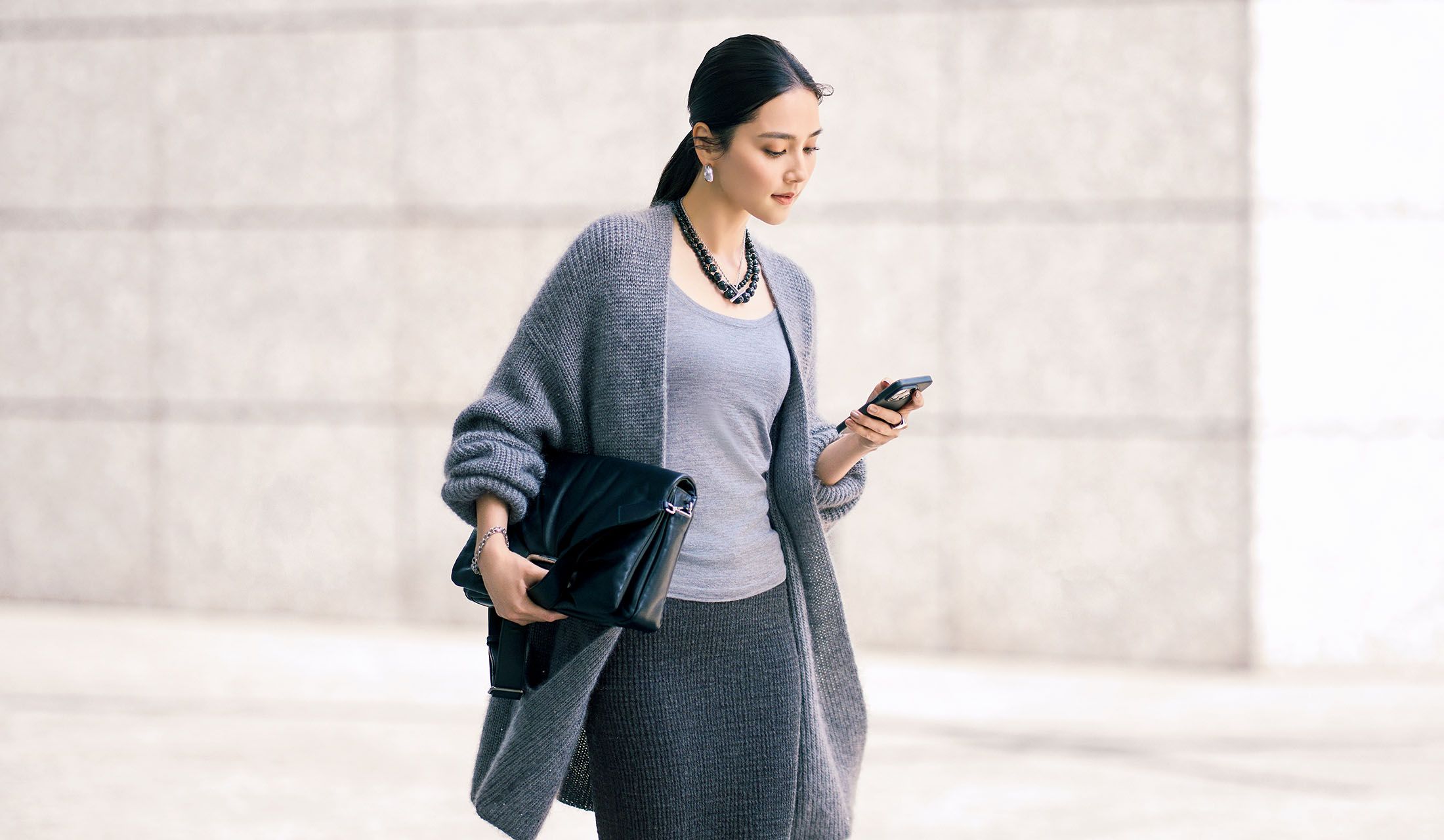 表情違いのニットを掛け合わせた、グレーのグラデーション配色。レザーのビッグバッグやクールなジュエリーを効かせて、ニットonニットをオフィス仕様にシフト。