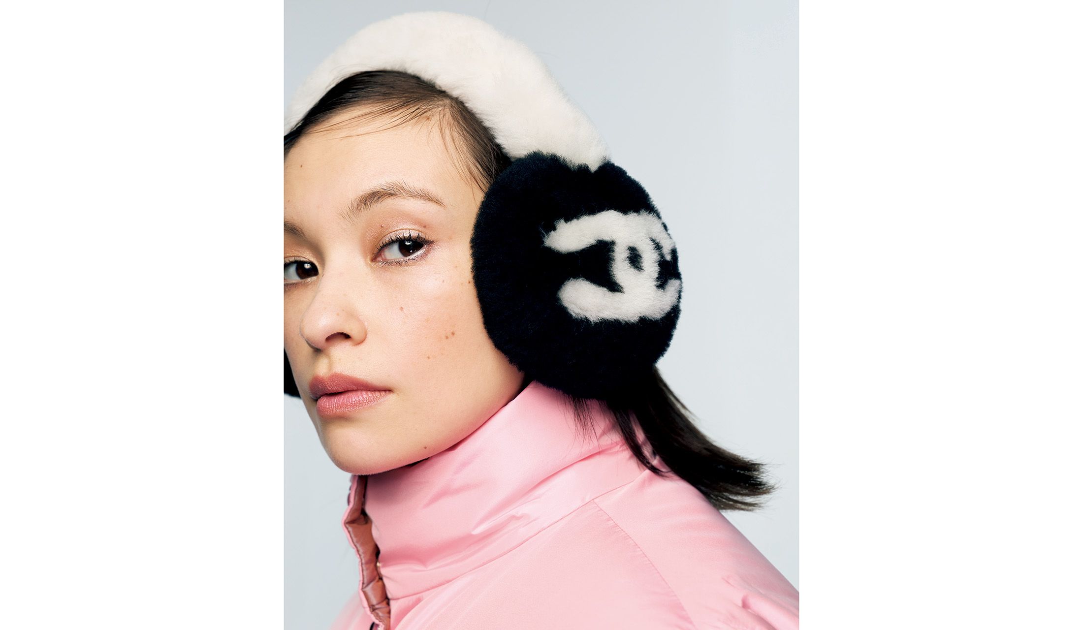 フワフワのシアリングムートンのイヤーマフは「わっ、かわいい!」と思わず声をあげてしまいそう。大きな「ダブルC」はデザインの力強さで、モノトーンに合わせればクールに、ピンクに合わせればかわいく、装いを際立たせて。
