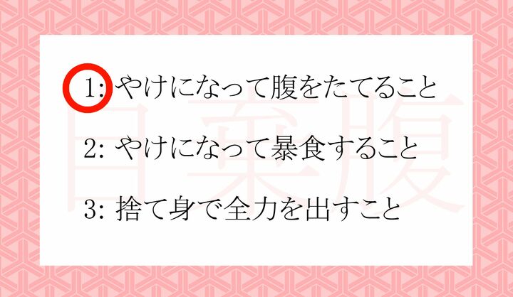 「自棄腹(やけばら)」の「腹」は、「腹をたてる」を意味し、「食べる」という意味ではありません。選択肢2の「やけになって暴食すること」は「自棄食い(やけぐ-い)」です。混同し、誤った使い方をする例があるようですので、今回、おさらいいたしました。