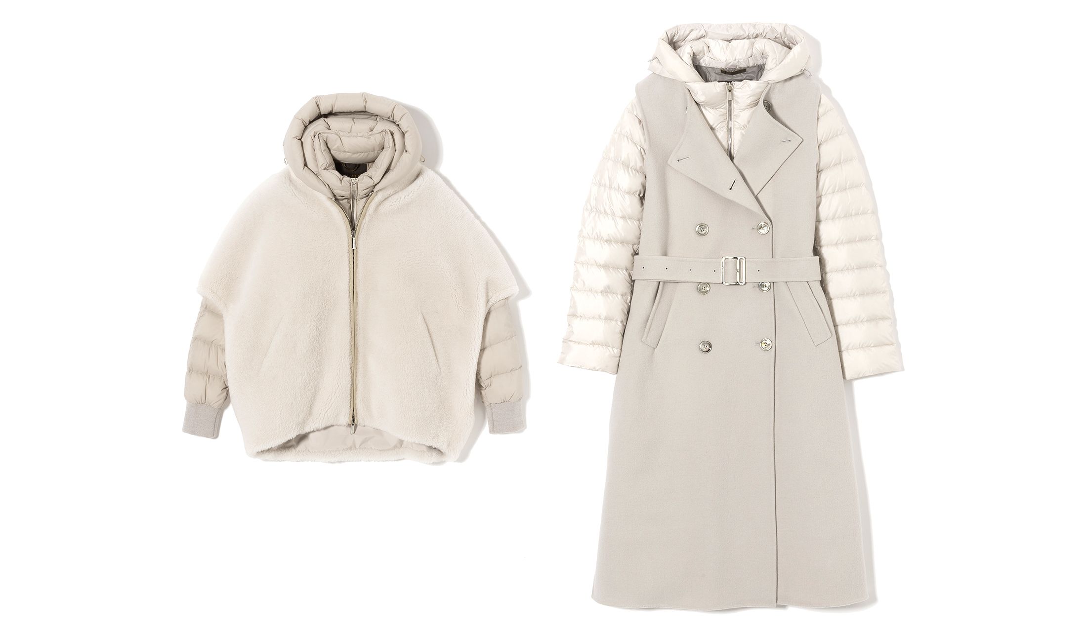 今回は「ムーレー(MooRER)」から、上品ムード溢れるチョークホワイトをまとった3WAY仕様の2着にフォーカス。ダウンウエアにショート丈のケープ風ブルゾンを合わせた人気モデル『ペガソ』と、ロングジレを合わせた『ハルナ』、どちらもリッチな素材感も魅力です。