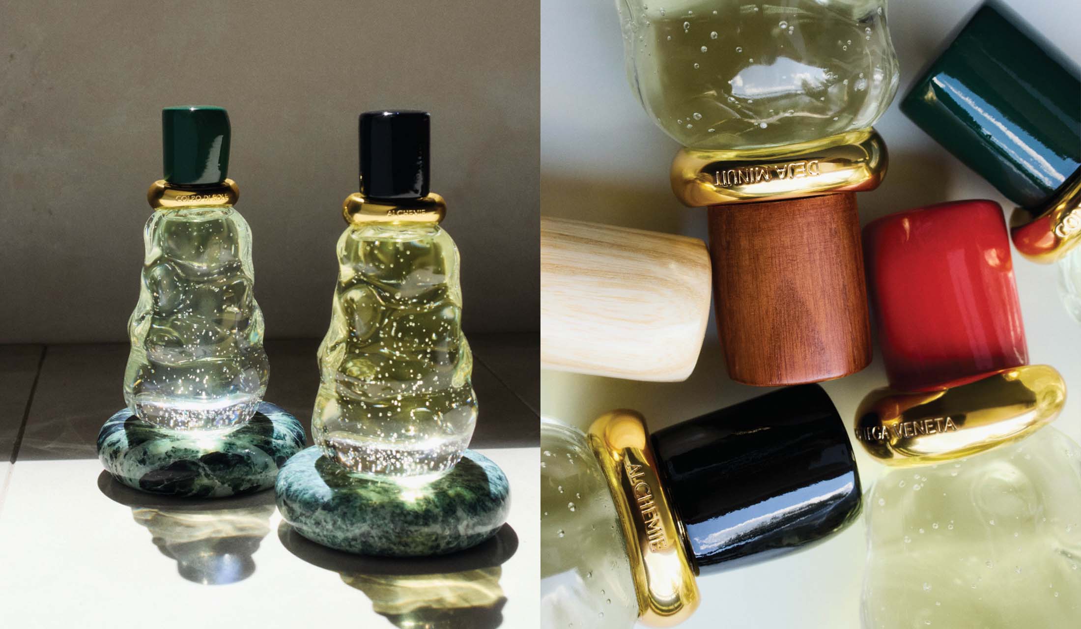 今回のコレクションの世界観で重要な役割を担うのが、思わず触れてみたくなる波打つフォルムのボトルデザイン。ヴェネツィアの干潟やボッテガ・ヴェネタのレザーの柔らかさにインスパイアされたというこのガラスボトルは、ムラーノ島の吹きガラス技術を再現した気泡を含み、ひとつとして同じものはありません。