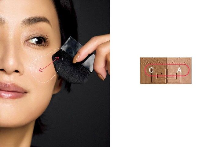 4色パレット(今回はパルファム ジバンシイ プリズム・リーブル・ブロンザーパウダー 001)の2色(画像AとC)をブレンドして、ブラシに均一に含ませたら、ふだんのチークで彩る位置=頬骨の高いところより、やや下側を意識した範囲になじませていきます。チークボーンを際立たせながら、自然な陰影を彩り、シャープな顔立ちに。正面から外に向かってぼかすと、肌と一体化した仕上がりに。