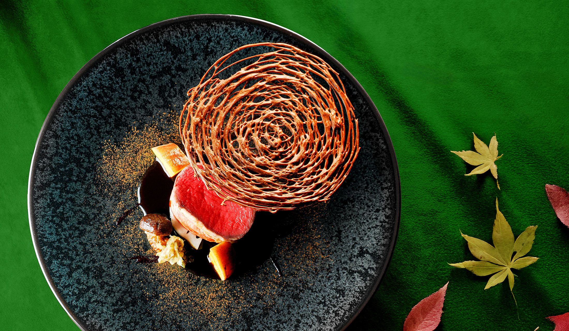鹿肉の上に乗せたカカオ風味のクロッカンで大地を、付け合わせの根菜で鹿のえさを表現しているそう。隈元氏によると、「フランス料理のセオリーとして、ジビエを使うときは、その動物が食べている食材を多く使うと間違いがない」とのこと。動物たちの世界観を尊重し、山の恵みをいただいていることを実感できます。