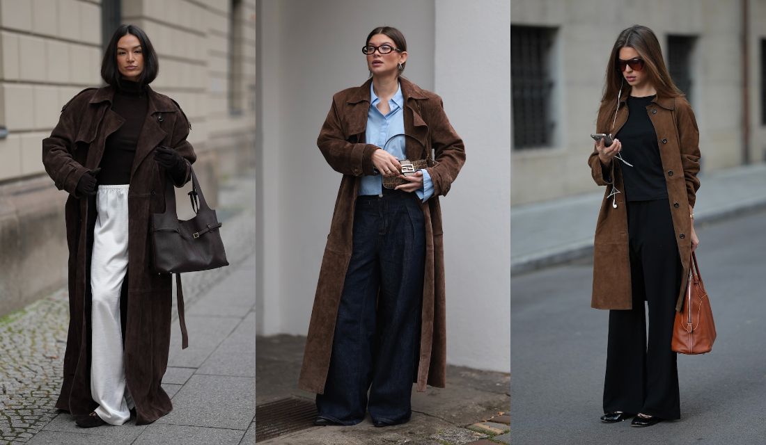 2025年10月下旬、デジタルクリエイターのソフィア・ガイスをベルリンでスナップ。王道のトレンチコートは、ブラウンのスエード素材にアップデート。マンネリを脱却しながら、季節に見合ったぬくもりを表現しています。さらにコートとカラートーンを揃えた濃紺ワイドデニムパンツを添え、程よいカジュアル気分をミックスしあか抜けを狙って。トップスは、コートと真逆な印象の、爽やかかつ軽快な水色シャツをセレクト。緩急をつけました。インせずとも様になるショート丈が、おのずとスタイルアップに繋がっています。