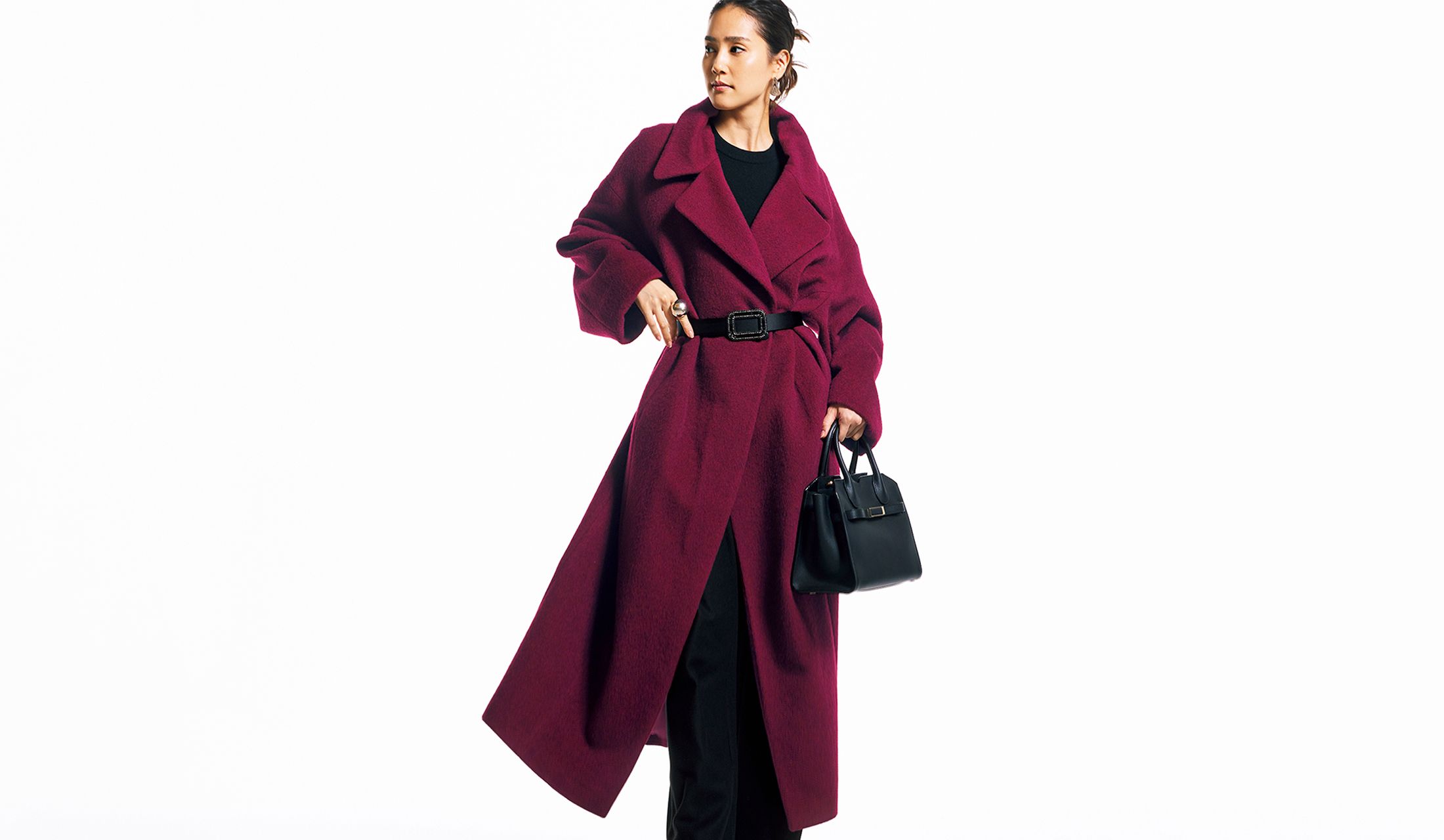 センシュアルな華やぎを放つボルドーのコートは、今らしさも着映え効果も満点! 加えて、小顔に見せる大きな襟とリラクシーな着用感も愛用ポイント。スマートさを意識するなら、コートの上からベルトをONしてXシルエットにアレンジ。ウエスト部分の細見えと裾の動きで、優雅にスタイルアップする。