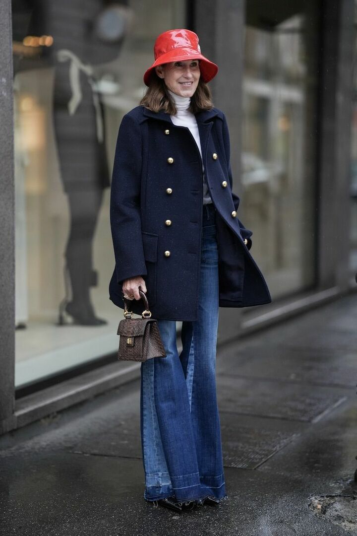 ゴールド釦がアクセントのネイビーミドルコートに、ブルーのフレアデニムパンツを合わせ一体感をオン。トップスは白のタートルニットを選び、清潔感を後押し。寒色ブルーとは対になる、鮮やかな赤のバケットハットを効かせキャッチーにフィニッシュ。