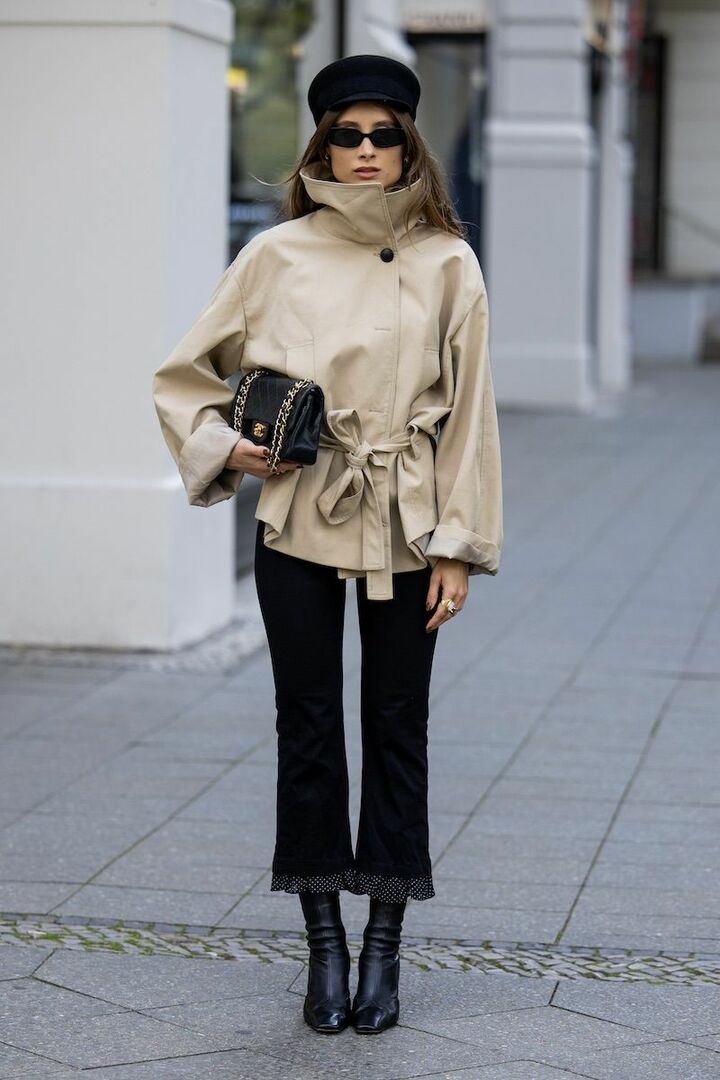 ショートトレンチコートの襟を立ち上げたり、フレアパンツを採用し構築的なシルエットをメイク。さらにすっと立ち上がった円筒状のピルボックス帽が視線を引き付けるから、絵になるスタイルが完成。