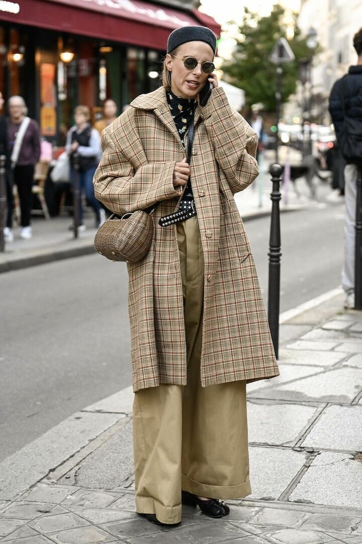 チェック柄コートとワイドチノパンツをベージュでリンクした冬のカジュアルに、花柄トップスやスタッズベルト、かごバッグを加え小気味よく見せて。仕上げにクラウンが低めのチャコールグレーピルボックス帽を加え、顔周りを優しく引き締め。