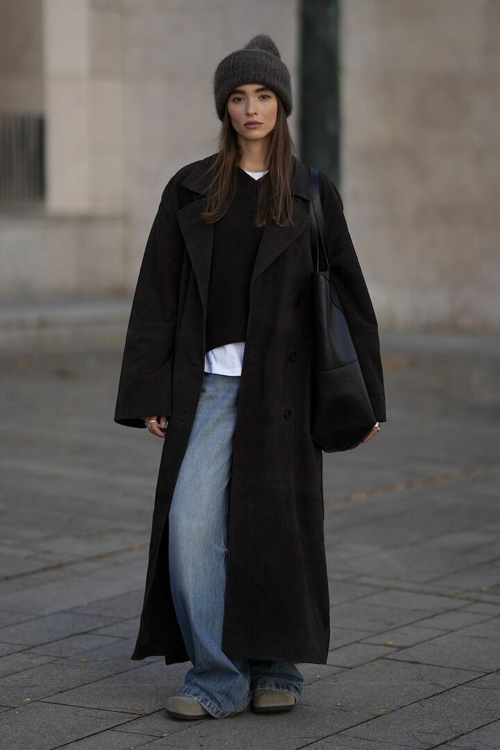 トップが高めのニット帽を使って縦の面積をかさ増しし、スタイルアップに繋げて。ニットとデニムのカジュアルアイテムと、上品なチェスターコートのミックス感もこなれ見えに直結。
