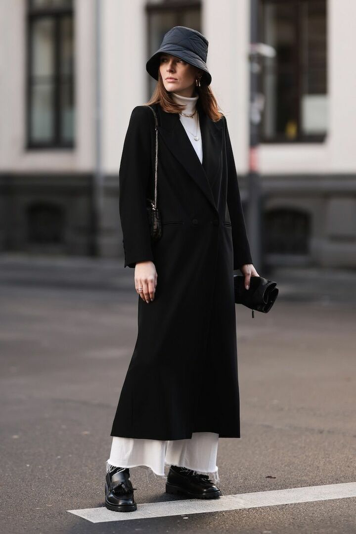 黒のチェスターコートやローファーを合わせたきれいめコーディネートに、白を散らして抑揚をプラス。バケットハットで黒の面積を増やし引き締め効果を倍増させながらも、ナイロン素材を選べば重く見える心配がありません。