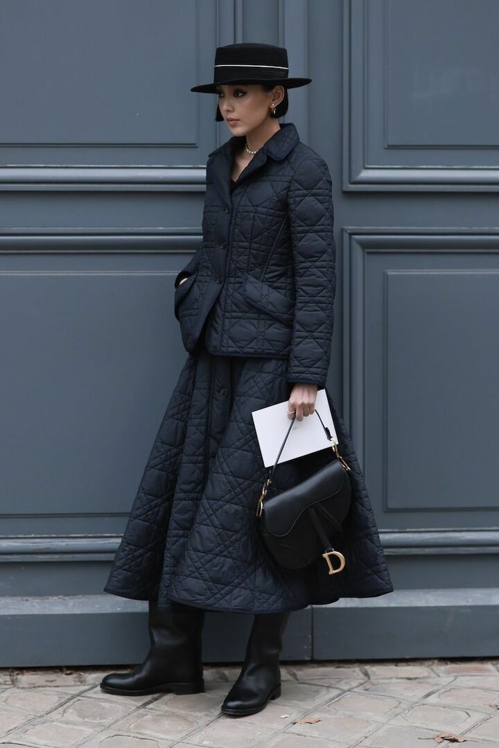 キルティング素材が新鮮なジャケットとフレアスカートのセットアップを活用して、着映えを実現。ナイロン素材なら、スポーティなキレのよさが加わり軽やかさを両立することに成功。そこに黒のウールハットと筒幅にゆとりのあるレザーブーツを合わせ、黒のハンサムさをアシスト。