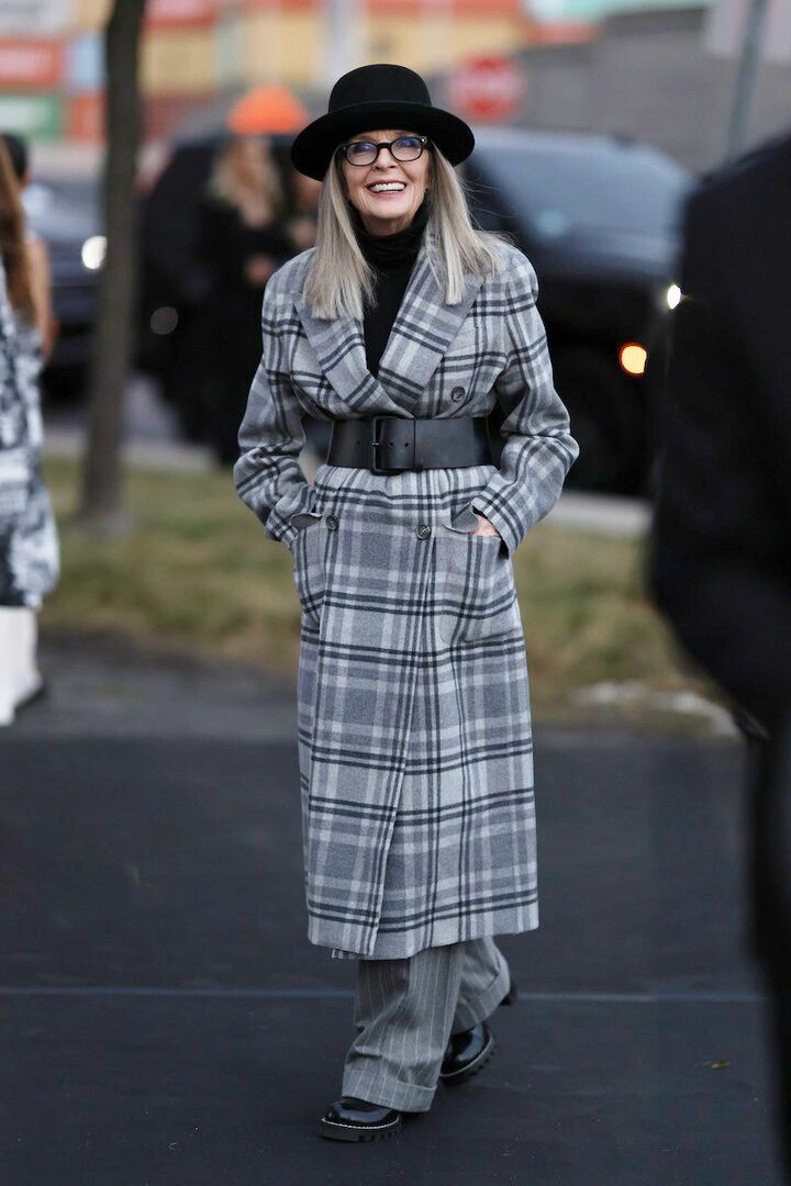 ハットを素敵に着こなすなら、スタイルを確立していた今は亡きダイアン・キートンをロールモデルに。グレーと黒の無彩色な装いに、クラシカルなハットが映えてシックなムードが盛り上がっています。チェック柄のコートとパンツを選びつつ、太ベルトでマークすれば洒落感が上昇。