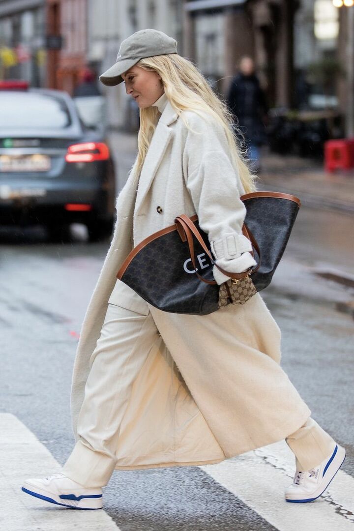 柔らかなベージュ×白の配色に任せ、洒落たニュアンスを醸して。セットアップのインにタートルニットを仕込み、奥行きをメイク。コートだけでなく、キャップを投入してベージュの面積を増やせばぬくもりを高めることに成功。ぼんやりしないよう、ヴィヴィッドなカラー小物を投入。