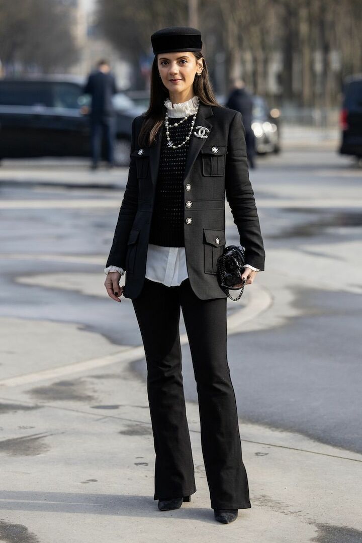 お呼ばれの機会が多くなるホリデーシーズン。凛としたジャケットに白のフリルネックブラウスを忍ばせたら、パールネックレスやブローチを足して華やかさをアピール。ピルボックス帽を加えれば特別感が漂います。