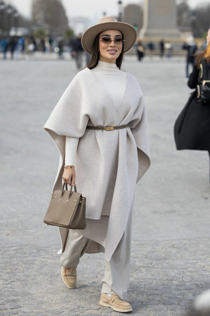 なかなかバランスが取りづらい、冬のコートとハットの組み合わせ。全体をニュアンスカラーでまとめて調和を取りつつ、ベルトマークしてくびれを強調すれば膨張せずに美バランス。細めのベルトがエレガンスを強調してくれます。