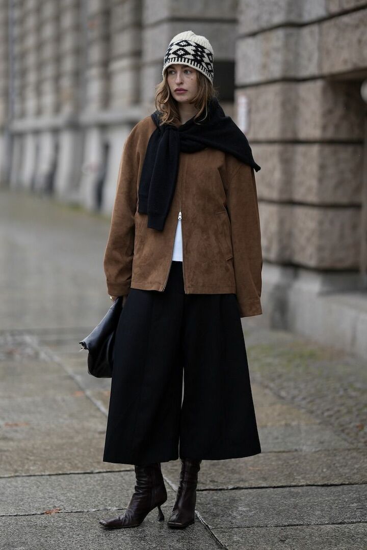 オーバーサイズのスエードブルゾンとフレアワイドパンツのシルエットがぼんやりしないように、柄のニット帽を加え視線を上に誘導。さらにブーツはスリムな形をセレクトし、メリハリシルエットを形成。