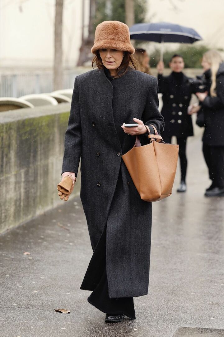 チャコールグレーのコートと、黒で統一したパンツとシューズというミニマルシックな装いも、キャメルの小物を足せば温度を感じる見た目に。愛らしいファー素材のバケットハットが親しみやすさをクリア。