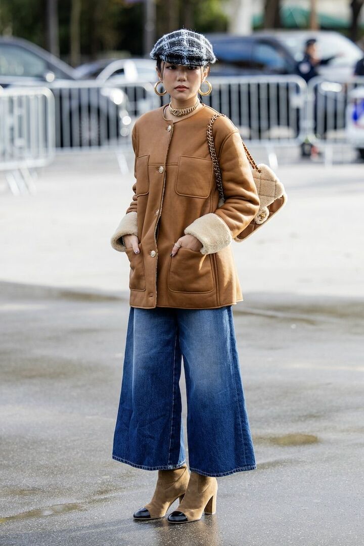 たっぷりとした幅のバギーデニムパンツとムートンコートを合わせたレトロスタイルには、クラシカルなハンチングがマッチ。ツイード生地を選び、さらに大ぶりのフープイヤリングを足してキャッチーさを倍増させて。