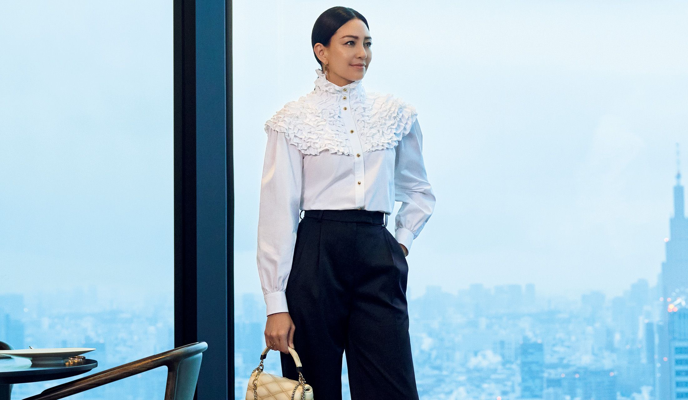 端正な白シャツベースなら量感フリルも甘すぎずシック