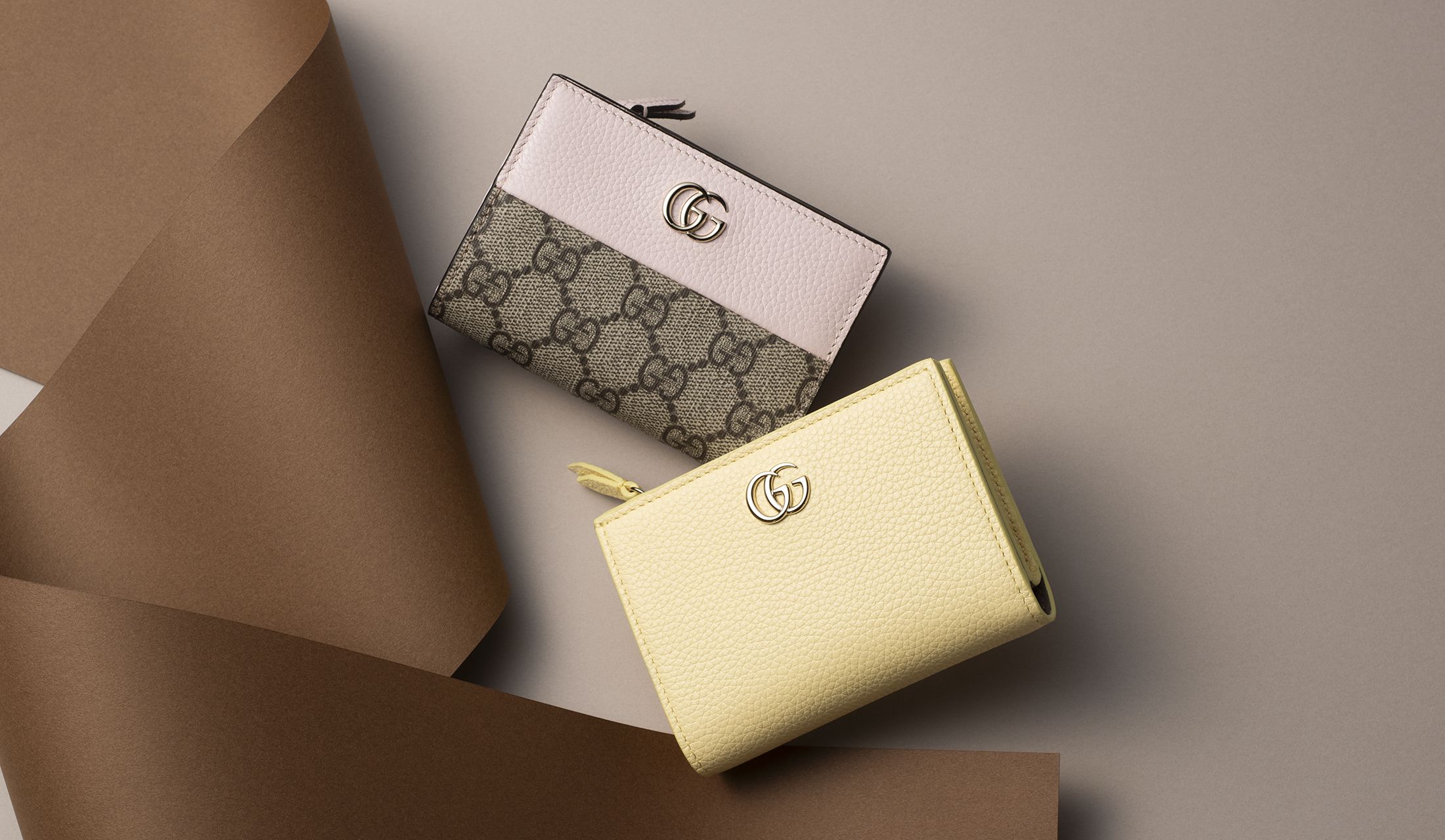 その日に向けてチェックしたい、15のラグジュアリーブランドの新作財布をご紹介するシリーズ企画から、今回は「GUCCI(グッチ)」にクローズアップ。パステルトーンのピンクとイエローが優しいニュアンスを宿す、二つ折りスモールウォレットをご案内します。