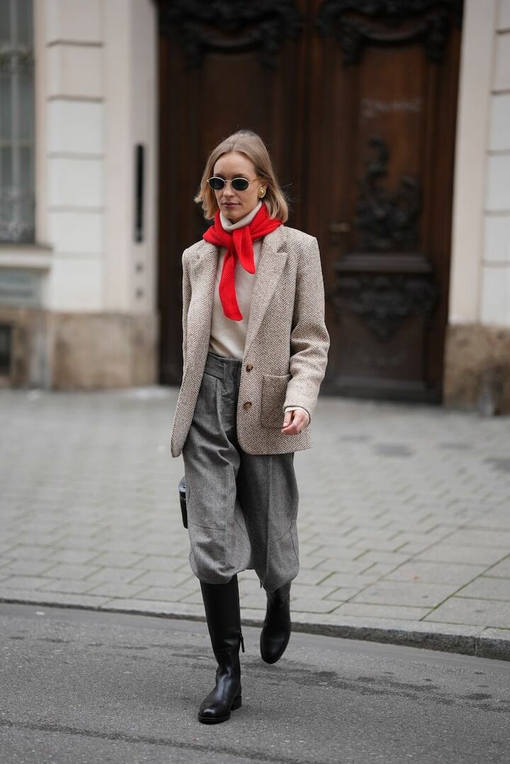 2025年11月7日、ウィーン出身のモデルでソーシャライトのマルリーズ・ピア・ファイフホファーは、ベージュのヘリンボーンジャケットにクリームのタートルニットを合わせ、ロングブーツとジョッパーパンツを合わせたクラシックな装いで登場。今季大人気の三角スカーフは鮮やかな赤を選んで肩に軽く結び、目を引くアクセントをプラス。落ち着いたニュートラルカラーのなかで、スカーフの赤が洗練された華やぎを添え、ヘリテージなムードを今っぽく更新しています。