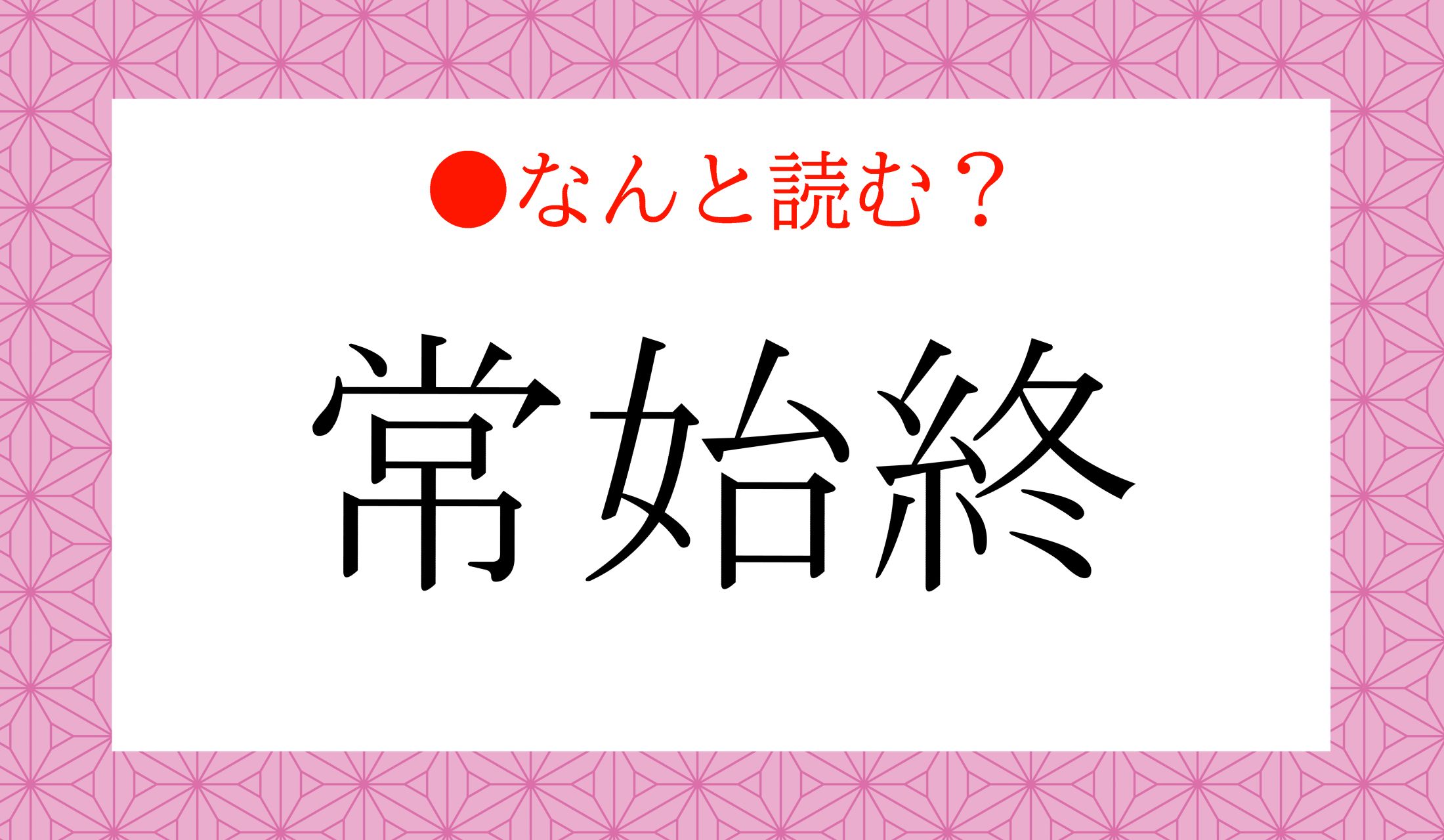 「常」の入った熟語は、音読みの「ジョウ」、訓読みの「つね」「とこ」のどれで読むか迷いますね。「常始終(つねしじゅう)」は、「つねに」と「始終」、同義の言葉を重ねて意味を強調した熟語です。一語の中で訓読みと音読みを組み合わせますが、これはこの言葉の定型的な読み方ですのでそのまま覚えておきましょう。