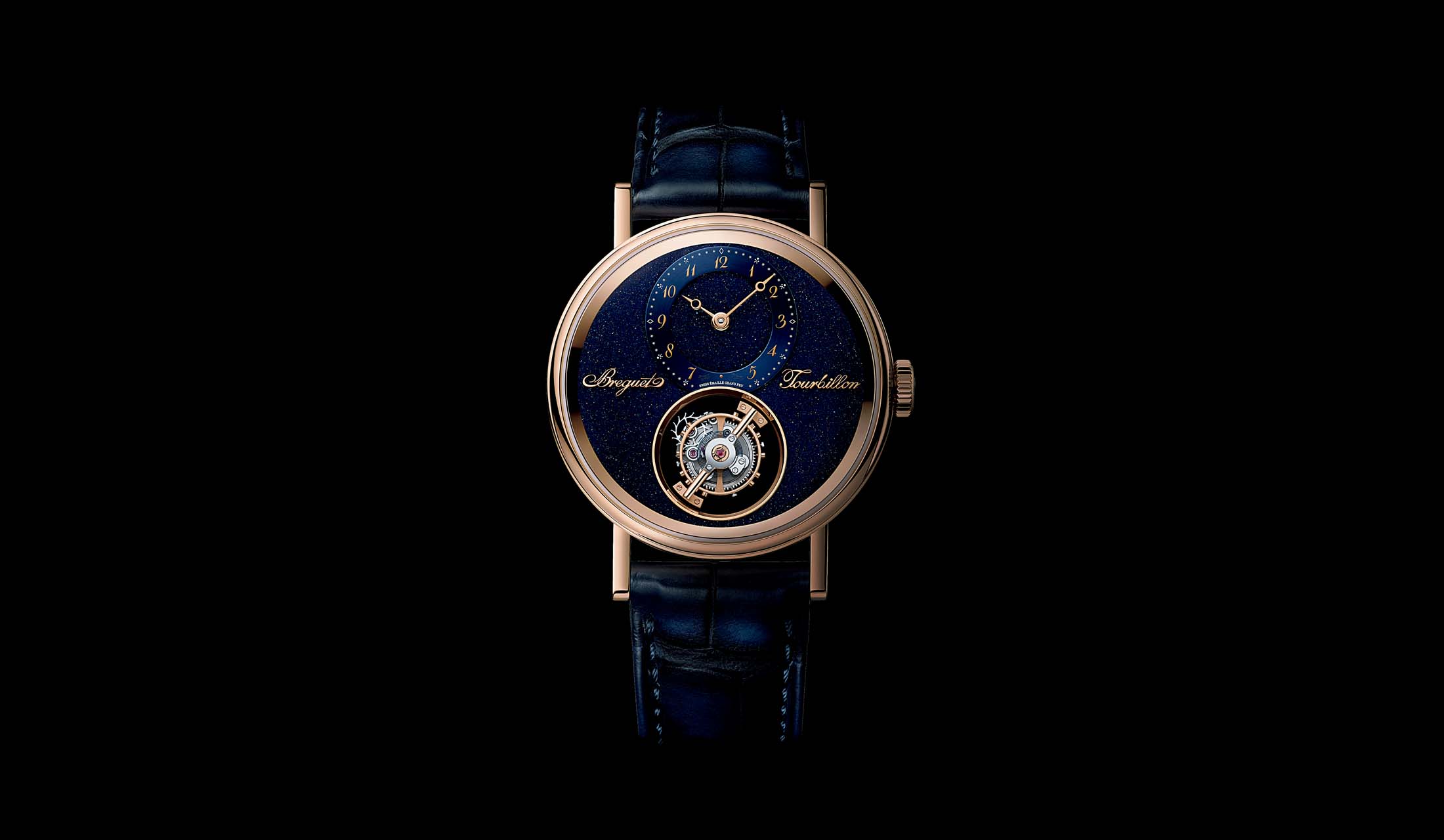 アベンチュリンの粒子が星のように瞬き、トゥールビヨンが宙に浮かぶ。ブレゲゴールドのケースに包まれた時計は、フライングとミステリー構造を融合し、伝統の技術を新たな表現へと昇華。深いブルーのエナメルが光を散らし、時の鼓動を伝える。