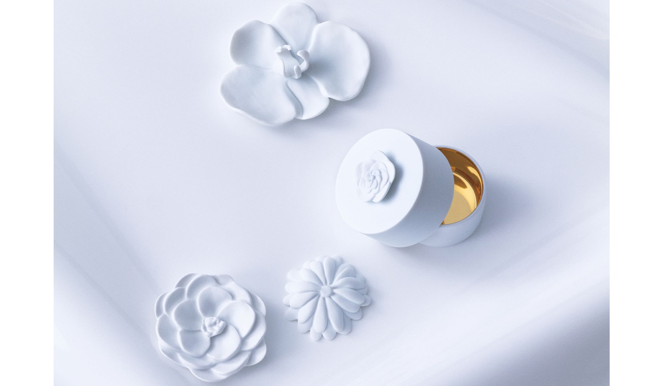 無垢を映す白、澄み渡る心を伝える白。特にヨーロッパの磁器の白の透明感は格別。この花のオブジェは、国際的に活躍する建築家、妹島和世氏とフランス・リモージュの磁器ブランド「ベルナルド」との出合いから生まれたもの。