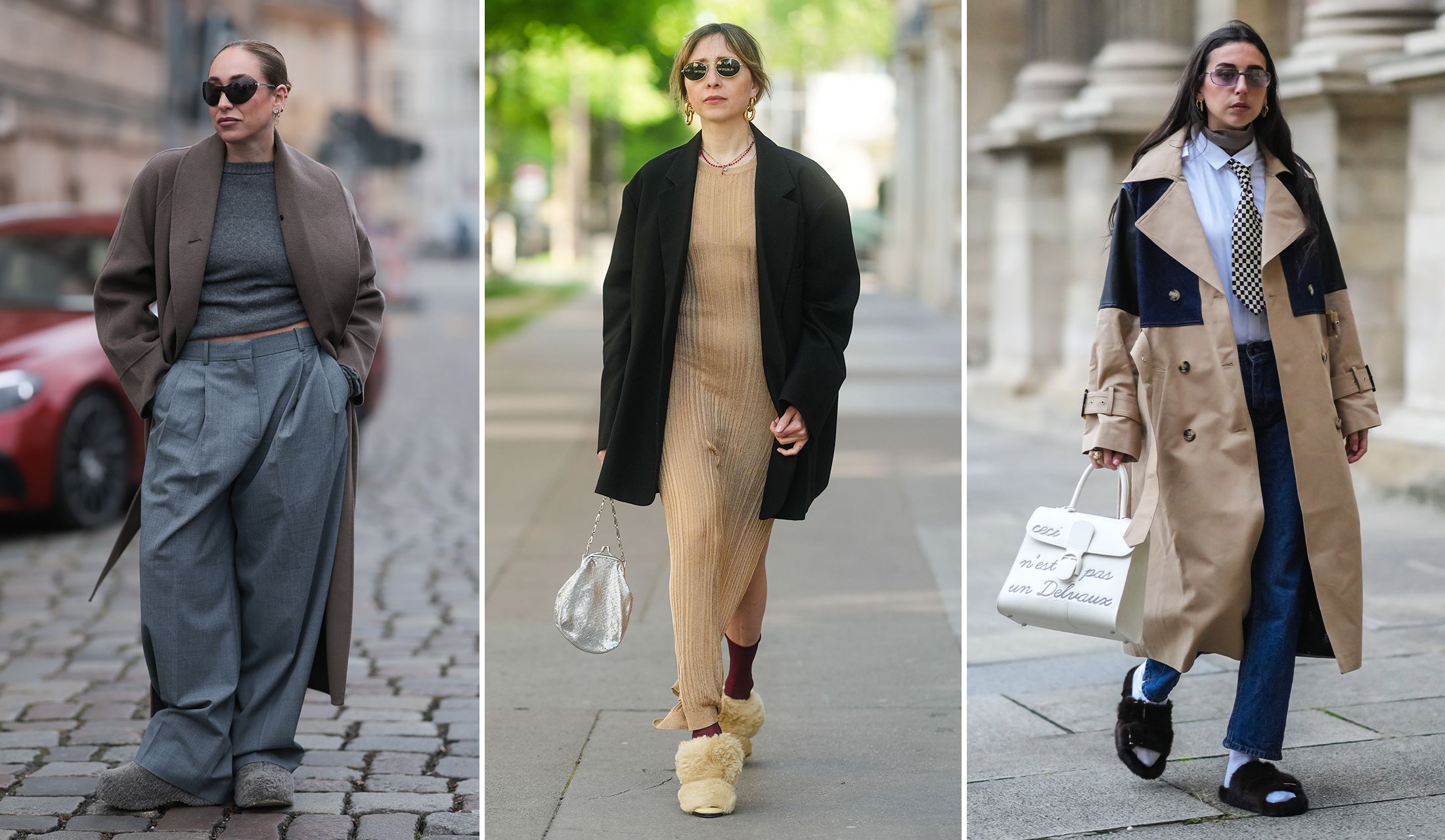 おしゃれ上級者として頻繁にスナップに登場しているインフルエンサー、ガブリエラ・ブルタゴ。パリで見かけられた日は、薄手のタートル&白シャツにネクタイを結び、デニム&トレンチコートを合わせていました。トレンチ×デニムなら、ローファーやメンズライクなレザーシューズを合わせがち。そこを彼女はサンダルにソックスという組み合わせをセレクト。それが抜け感になり、リラックスムードを漂わせています。スポーツタイプのサンダルでもファーが全面にあしらわれていて、スタイリッシュさ抜群です。足元のセレクトひとつで、今っぽいこなれカジュアルができ上がるお手本です。