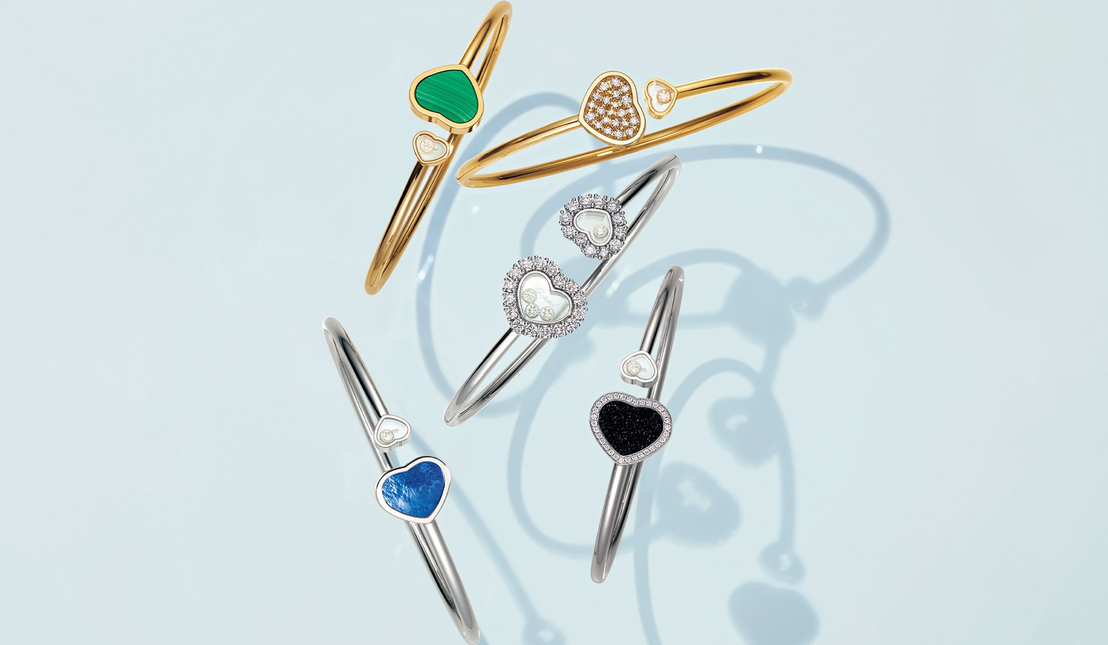 天真爛漫なスピリットと呼応し、遊び心に溢れたハート形。「ショパール」らしいダンシングダイヤモンドや天然素材を用いたバングルは、自由に重ねるほどに自分らしく輝いて。