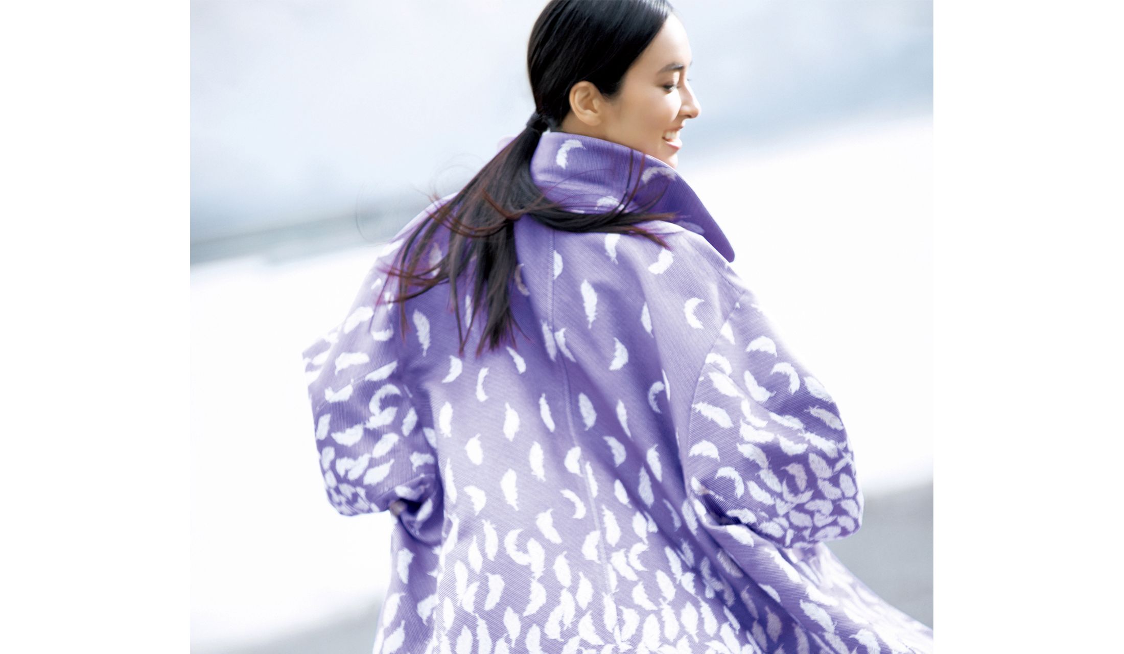 西陣織の老舗“HOSOO”のプレタポルテラインから登場した一着は、古代、日本で最も高貴な色とされていた「ニホンムラサキ」に着想を得た彩りや豊かな表情をもつ箔に、美意識と技を感じさせて。