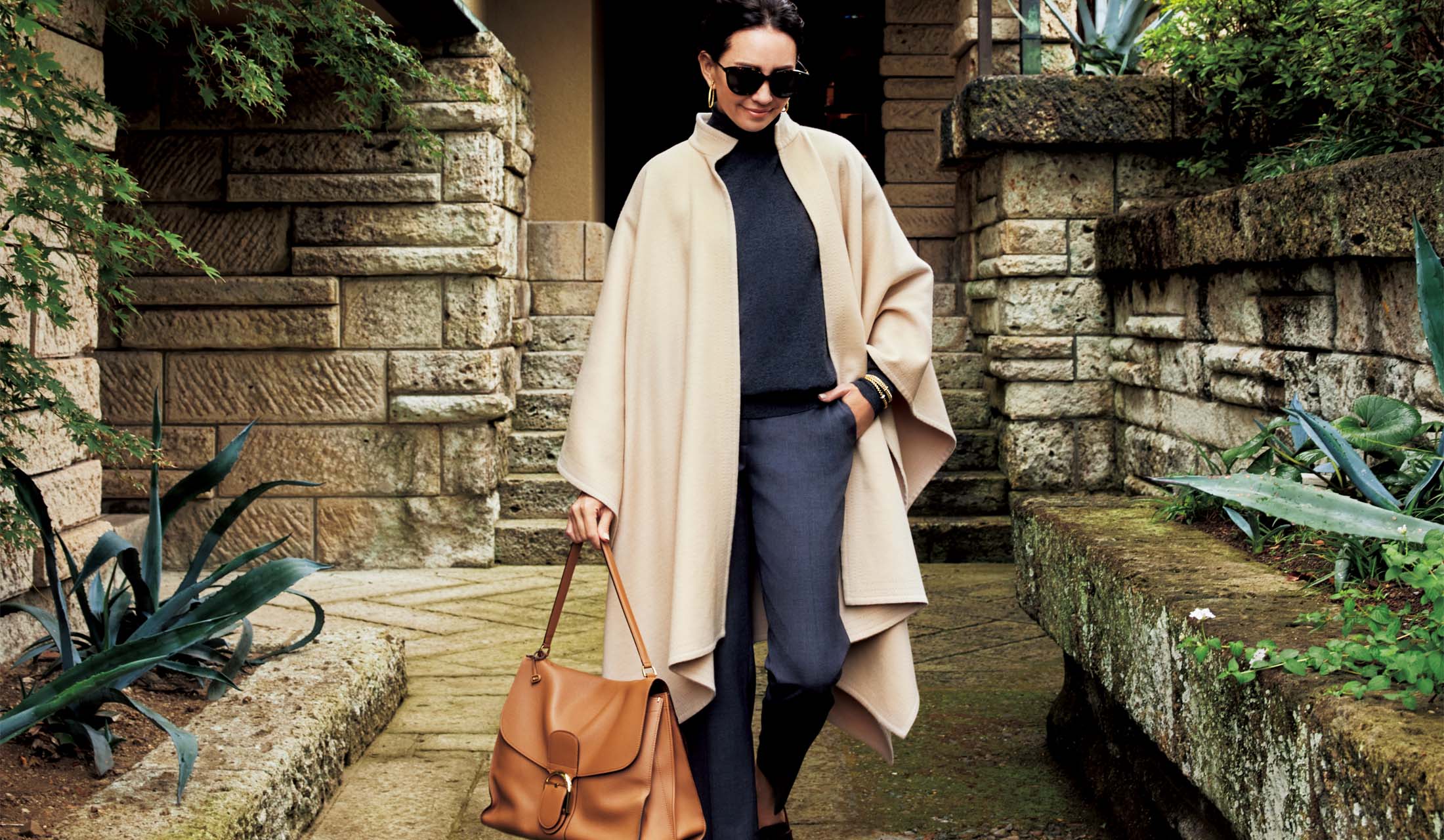 屋内外を問わず活躍するのが、脱ぎ着を必要としないカシミア一重仕立てのケープ。「多くの人が集まる場で、スマートさを印象づけます」(リタさん)。