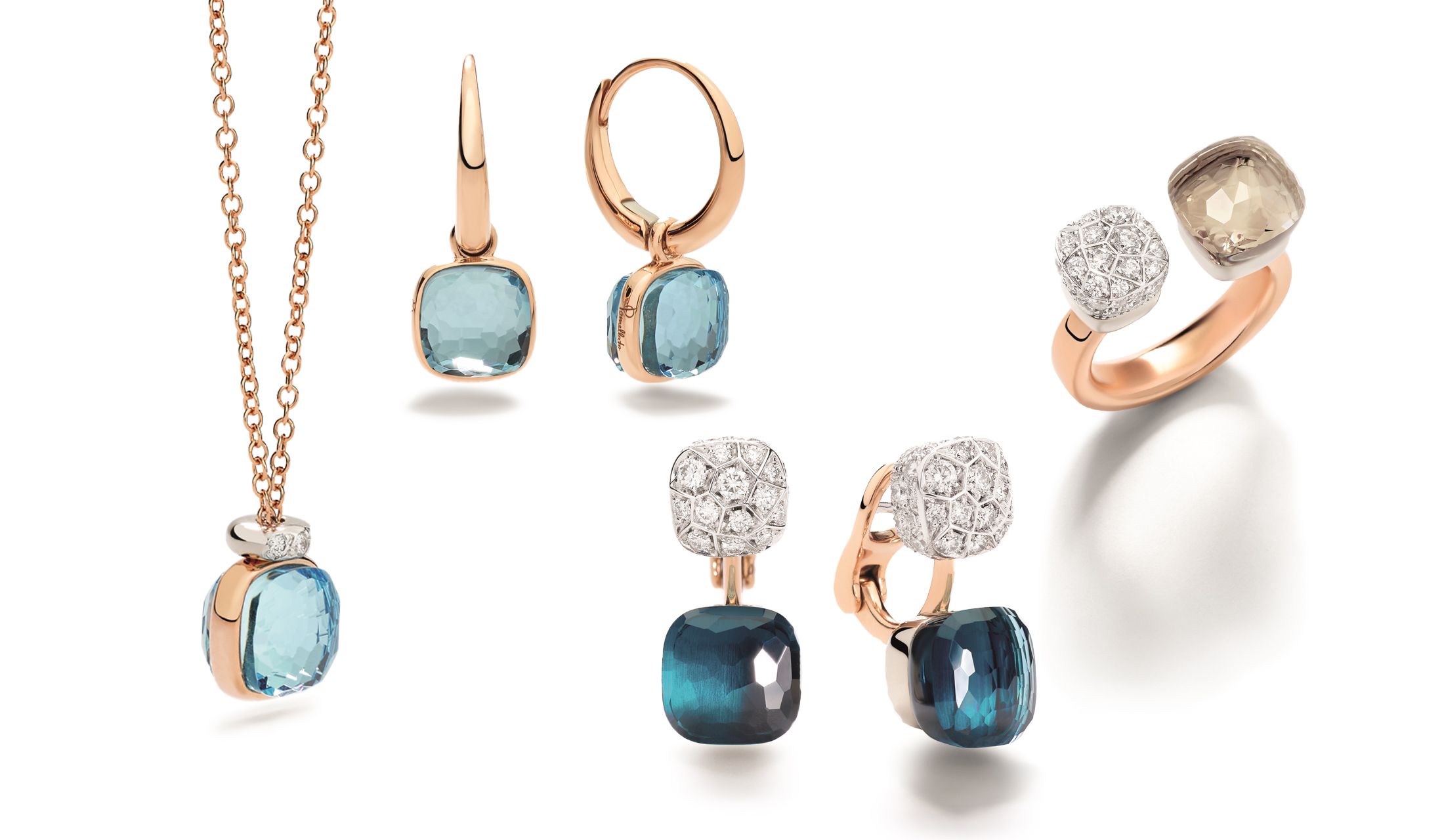 地中海の澄んだ水のような清涼感のあるスカイブルートパーズの上に、ブリリアントカットのホワイトダイヤモンドが飾られた新作ペンダント。ローズゴールドのチェーンの上で浮かんでいるかのようなグラフィカルなデザインが、「ポメラート」ならではの個性を漂わせます。