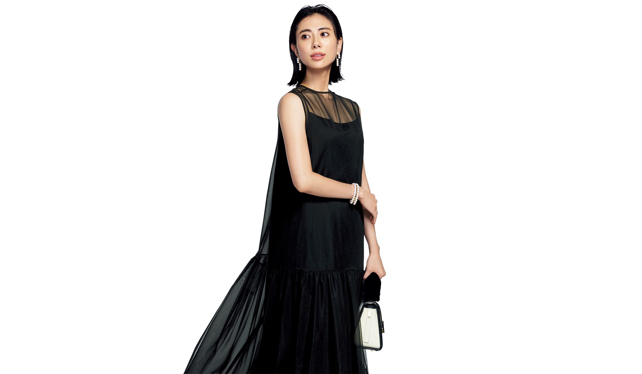 繊細な透け感がセンシュアルなレイヤードワンピース。レングスに差をつけたシアーな素材を重ねることで、奥行きのあるフレアシルエットに。